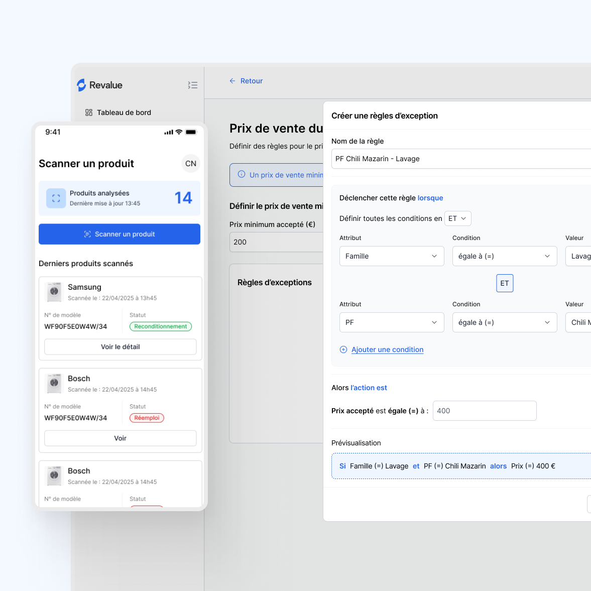 Automatisation de la qualification de vos produits : Paramétrez vos propres critères de qualification. Revalue se base ensuite sur ces règles pour déduire le potentiel de revalorisation de vos produits.